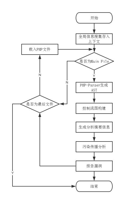 首先载入用户输入的待扫描的工程目录中所有的PHP文件,并对这些PHP文件做判别,如果扫描的PHP文件是Main file,即真正处理用户请求的PHP文件,那么对这种类型的文件进行漏洞分析。如果不是Main file类型,比如PHP工程中的类定义,工具函数定义文件,则跳过不做分析。