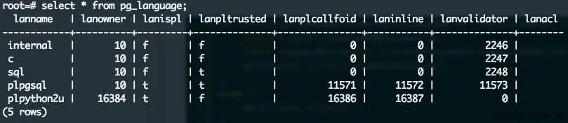 我们可以根据返回来判断利用哪个语言(plpython2u、plpythonu、plpython3u 等等)。