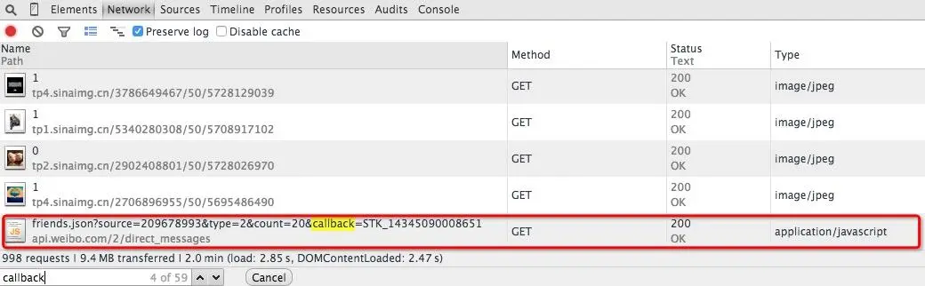 感觉差不多了的时候,我们Ctrl+F进行搜索筛选,搜索关键字是一个绝活,你可以站在程序员的角度去想,写这个接口的规范一般是在服务端接收callback参数。