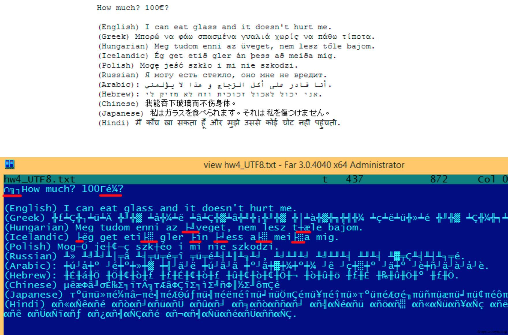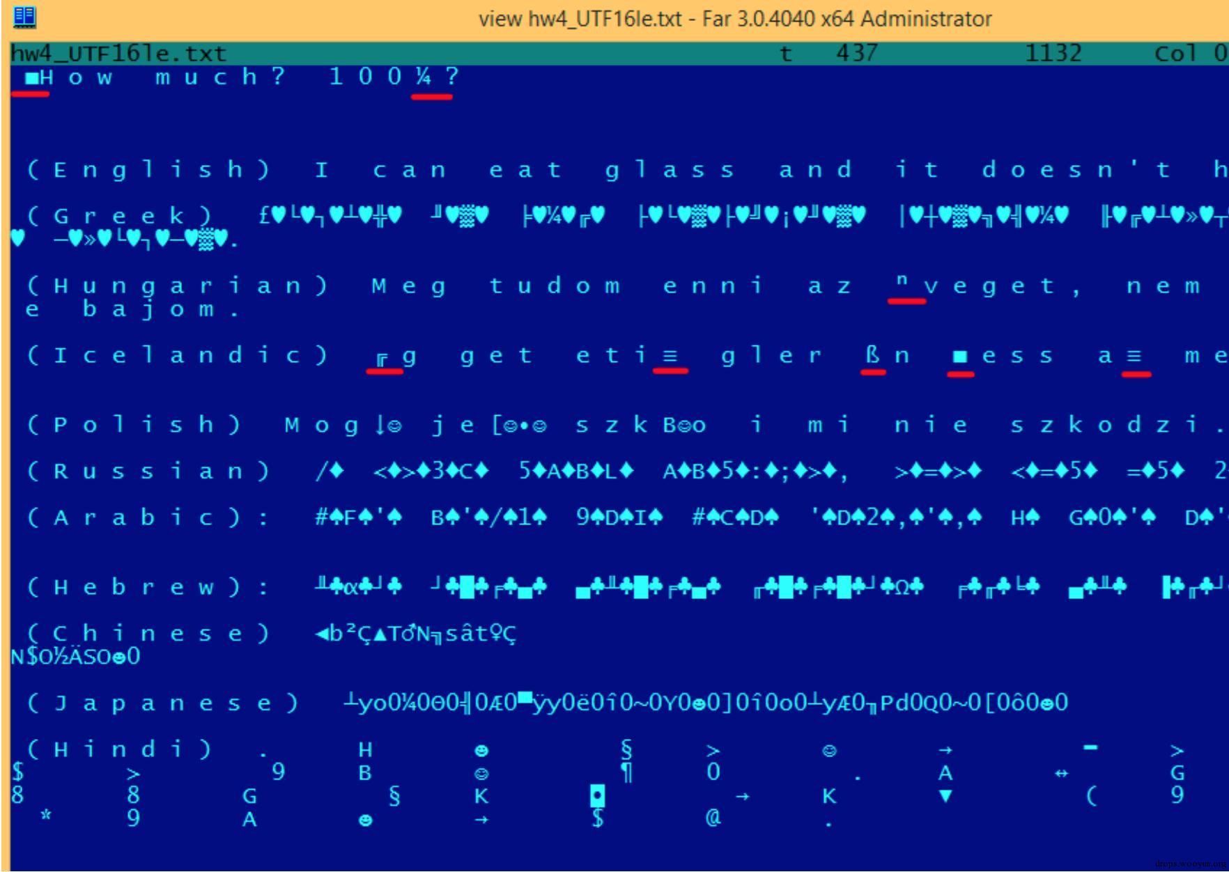 我们来看看不同语言中的符号在UTF-8中是如何被编码的,在FAR中看上去又是什么样的,使用437内码表: