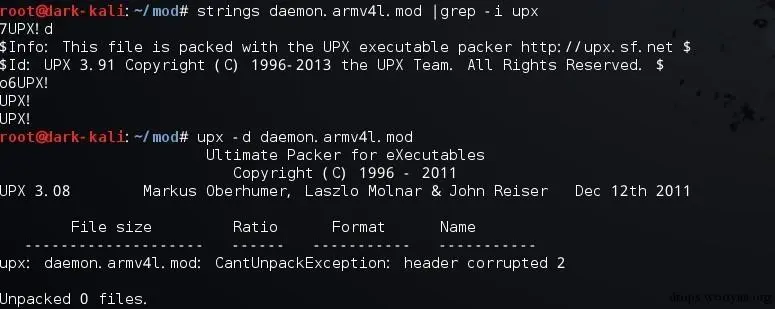 所有的蠕虫主体执行文件均通过upx壳进行压缩,但通过破坏upx header等方式防止upx –d的自动化脱壳,这在linux类的恶意样本中并不多见。