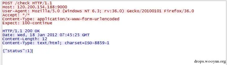 蠕虫同时会监听9000和1337端口接受外界请求,其中9000端口是一个非常重要的感染标志。蠕虫周期性的会检查good2中机器的存活情况,确保感染率,在对SSH进行爆破前,蠕虫先会向9000端口发送post 请求时,如果其响应“{status: 1}” 则表示该机属于存活状态,跳过SSH密码尝试过程,如下所示: