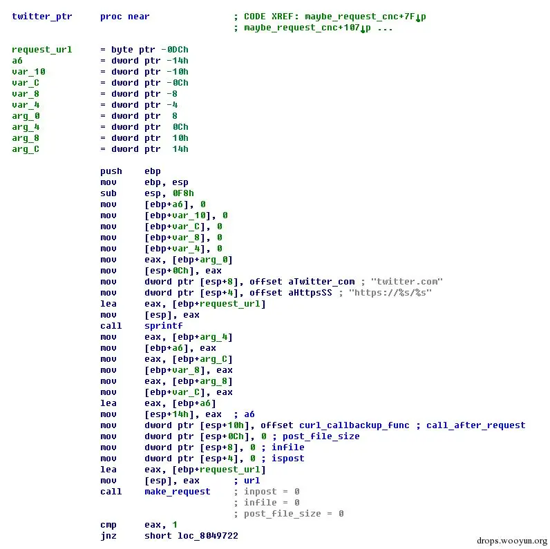 蠕虫利用了公共社交网络平台进行控制,并采用两阶段获取C&C IP的上线方式,这是我们之前捕获的蠕虫中没有发现过的。该蠕虫通过www.twitter.com、www.reddit.com、my.mail.ru等网站上搜索特定的信息,解析页面内容来找到第一阶段控制IP信息,来看下这个流程是怎么进行的: