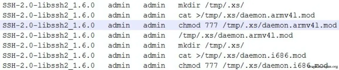 为了防止目标环境没有wget或者tftp等命令,这里蠕虫采用了一个比较tricky的方式方法,直接在server端使用cat > xxxx.mod的方式传送文件,下图是我们抓取到的命令执行内容: