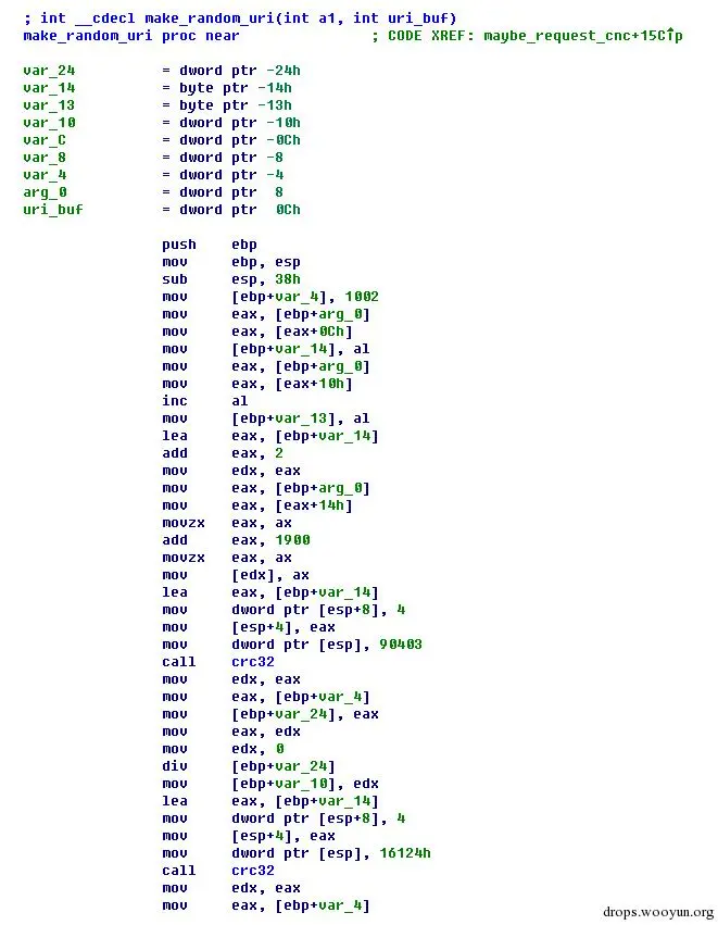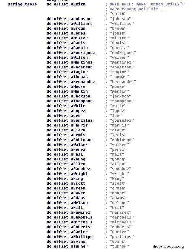 通过在twitter上搜索关键字获取一阶段IP地址,其他连接www.mail.ru以及www.reddit.com的情况类似。在这些社交平台上搜索的关键字,蠕虫通过一定的算法来进行得到,有点fastflux的感觉。准备连接前,蠕虫会根据内置的算法从www.google.com返回Server Response中的Date域中提取出来的值作为变量生成随机数,再使用随机数从预先定义好的词表字典中来选择两个对应的词,然后加上随机数拼接成一个合适的url,如下所示: