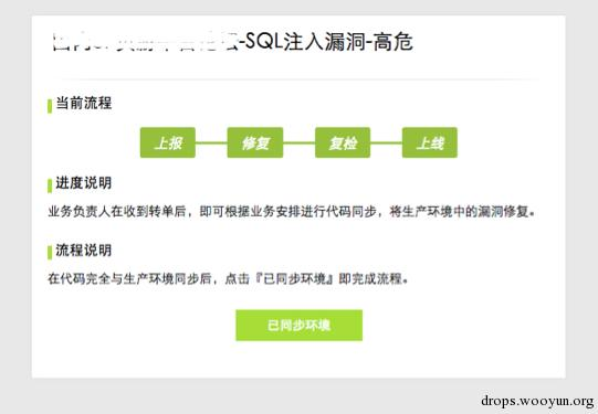 在漏洞测试完成后后,研发或运维会根据实际情况,对代码进行完整的同步。在全部完成后,点击『已同步环境』则漏洞修复流程结束。(平台发=>研发/运维收)