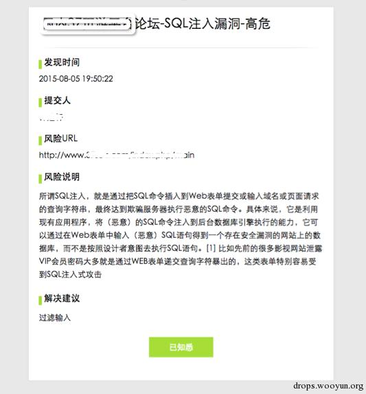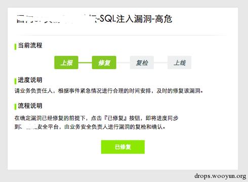 发现漏洞,上报漏洞(通过安全平台发起=>研发收到该漏洞信息邮件)他可以通过登录平台查看详细信息,或者通过邮件了解该漏洞的细节。在确认知悉后,点击『已知悉』会通过该方式对安全平台的API进行一次请求,并且更新当前该漏洞的处理状态。(安全提交=>平台发送=>研发收)