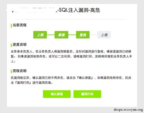 在确认漏洞已经修复完成后,安全人员针对漏洞进行复查,灰度测试环境上线。(平台发=>安全收)在这里,安全人员有两个选择,一个是『确认修复』、一个是『漏洞打回』由于有的时候漏洞有可能修复不全面,导致可以二次利用。所以有可能漏洞会被打回。(平台发=>安全收)
