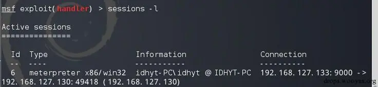 之后我们在debian系统的服务端会看到我们已经监听到了这个端口,看下会话信息: