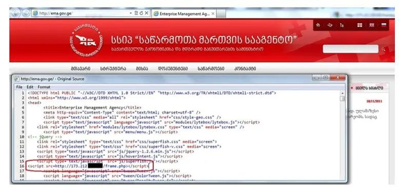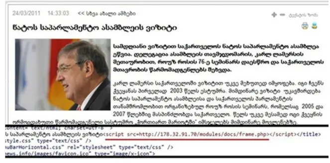 - 一些与新闻行业相关的格鲁吉亚网站被黑了。(恶意脚本只注入到了页面上,在这些页面上出现了一些特定的信息)