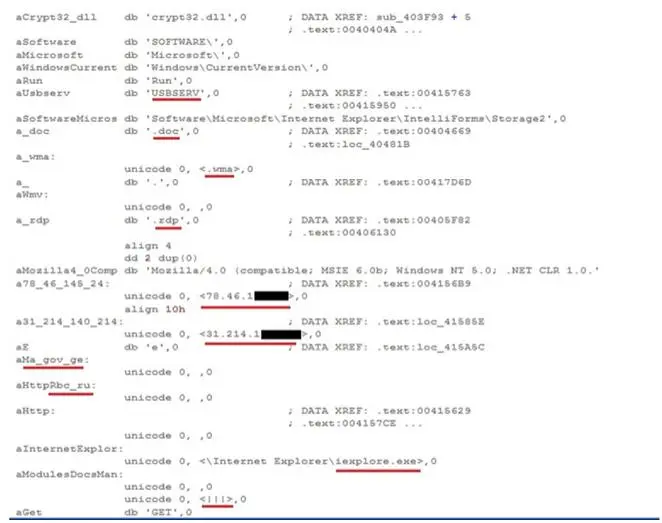 完全控制受感染的计算机。 木马会搜索受害者MS Office和PDF中的敏感词汇。