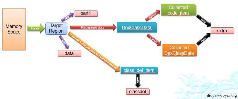 现在我们要解析class_defs的东东了。不整代码了,用文字简单来说,就是模仿Android的过程,我们把每个class_data_item解码为内存中的对象(有LEB128编码),便于我们的修复。