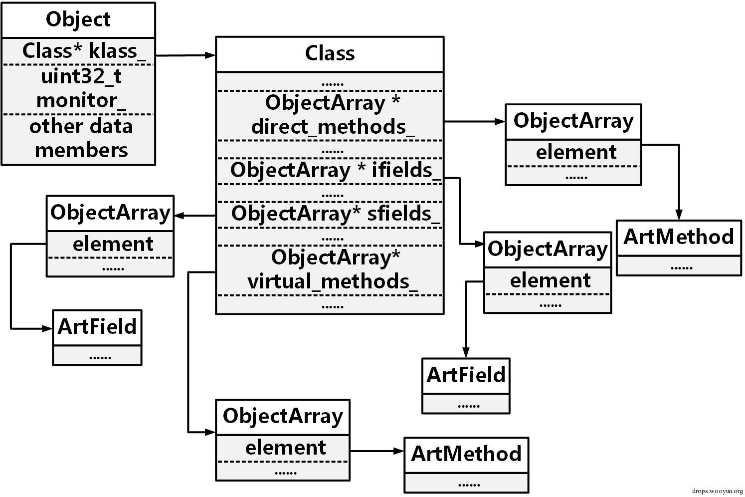 运行时读取存储在Dex中的每个class,并用来填充一个生成的Class对象,其中包含了class的所有成员,这样一个class才能被使用;图4表示了ART和DVM下的Class对象的结构