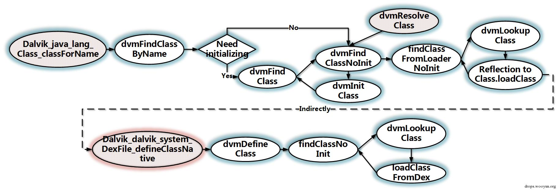 这个就是遍历dex文件中class_defs区段里每一个class_def_item,并逐一加载和初始化,在ART里我们使用FindClass函数来加载类,EnsureInitialized进行初始化;在DVM中用dvmDefineClass加载,dvmIsClassInitialized 和dvmInitClass来初始化。