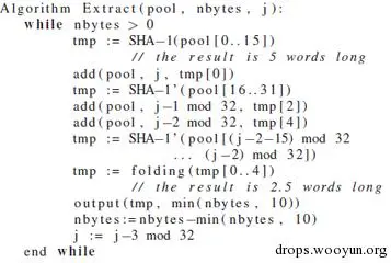 从熵池中提取随机bit的方式为:(1)对提取的bit做hash;(2)修改池子状态;(3)减小计数器。 依据如下算法: