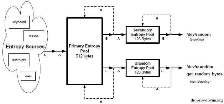 Adding physical entropy: 桌面及服务器PC使用的熵源有4个:鼠标、键盘活动,磁盘输入输出以及特殊中断。事件发生时,会产生一个32bit的word表示时间(系统开机到现在经历的毫秒数),一个word编码它的属性(事件类型、)。此外,同一类型连续事件的时序会被用来估算该事件提供的熵值。