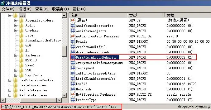 修改注册表 HKLM\System\CurrentControlSet\Control\Lsa 路径下的 DSRMAdminLogonBehavior 的值为2。