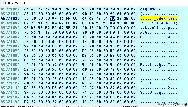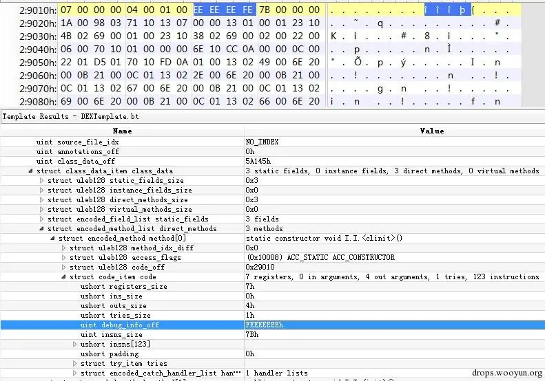 可见其在计算该偏移处的uleb值时得到的结果小于0,从而抛出异常。 在前文《Android程序的反编译对抗研究》中介绍了DEX的文件格式,其中提到与DebugInfo相关的字段为DexCode结构的debugInfoOff字段。猜测应该是在此处做了手脚,在010editor中打开dex文件,运行模板DEXTemplate.bt,找到debugInfoOff字段。果然,该值被设置为了0xFEEEEEEE。