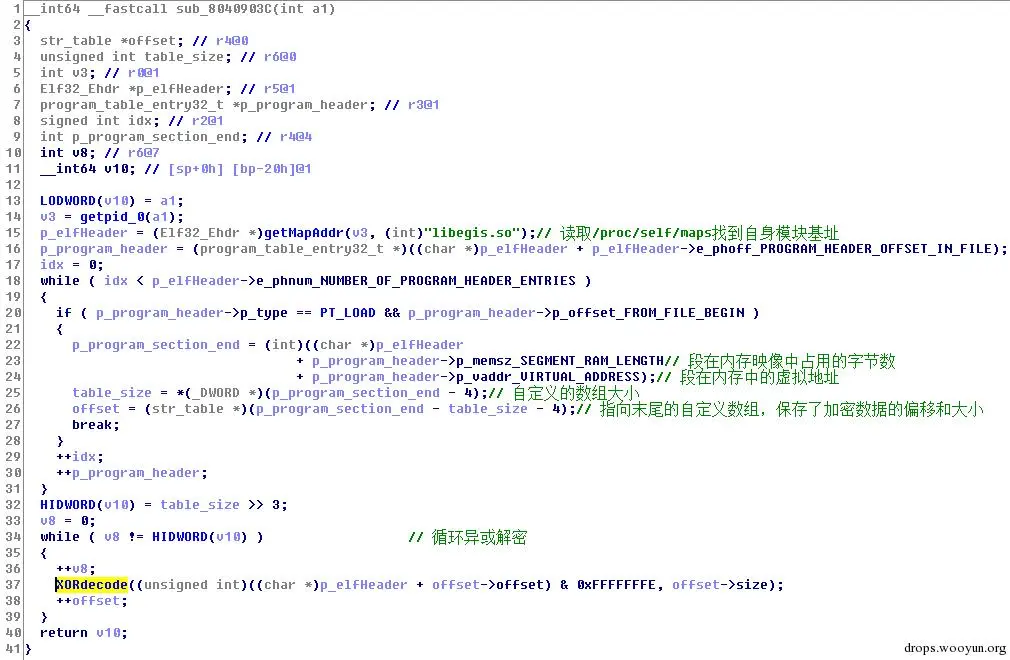 sub_8040903C函数里就是脱壳了,首先读取/proc/self/maps找到自身模块基址,然后解析ELF文件格式,从程序头部表中找到类型为PT_LOAD,p_offset!=0的程序头部表项,并从该程序段末尾读取自定义的数组,该数组保存了被加密的代码的偏移和大小,然后逐项解密。