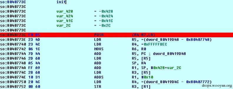 上面几处反调试点在检测到调试器后都直接调用exit()退出进程了,所以直接nop掉后按F9执行。然后就断在了init函数入口,顺利过掉反调试: