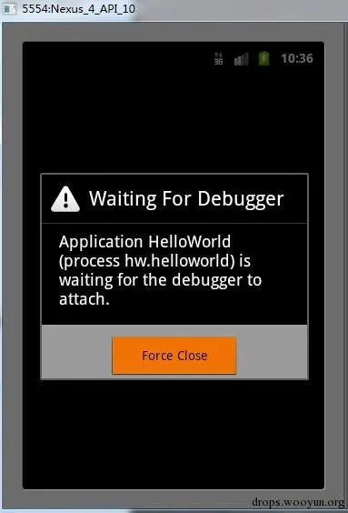 2 以调试模式启动APP,模拟器将出现等待调试器的对话框。