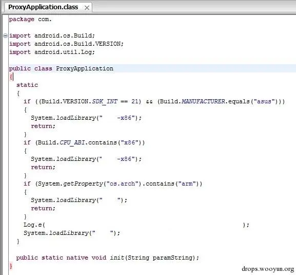 ProxyApplication类只有2个方法,clinit和init,clinit主要是判断系统版本和架构,加载指定版本的so保护模块(X86或ARM);而init方法也是native方法,调用时直接进入了so模块。