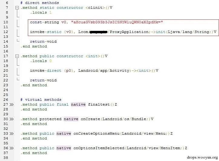 其基本原理是在dex文件中隐藏虚方法,运行后在第一次加载类时通过在方法(如果没有方法,则会自动添加该方法)中调用ProxyApplication的init方法来恢复被隐藏的虚方法,其中字符串"aHcuaGVsbG93b3JsZC5NYWluQWN0aXZpdHk="是当前类名的base64编码。