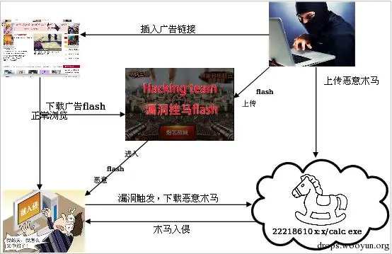 1) 该木马是通过网页挂马的方式传播的,经分析黑客用来挂马的漏洞是前段时间Hacking Team事件爆出的flash漏洞CVE-2015-5122。新版本的Flash Player已经修复了该漏洞,但是国内仍有大量的电脑未进行更新,给该木马的传播创造了条件。