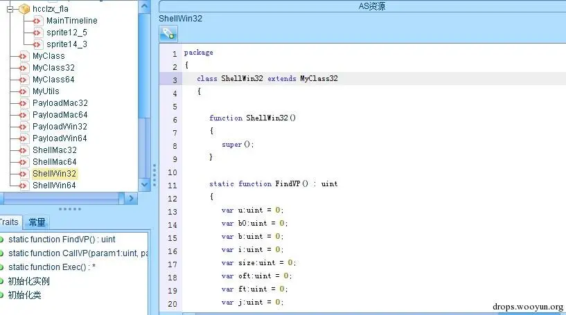 通过反编译flash文件可以发现,该flash是在Hacking Team泄漏代码的基础上修改而来的,该flash使用doswf做了加密和混淆,以增加安全人员分析难度。如图4所示为挂马flash代码。