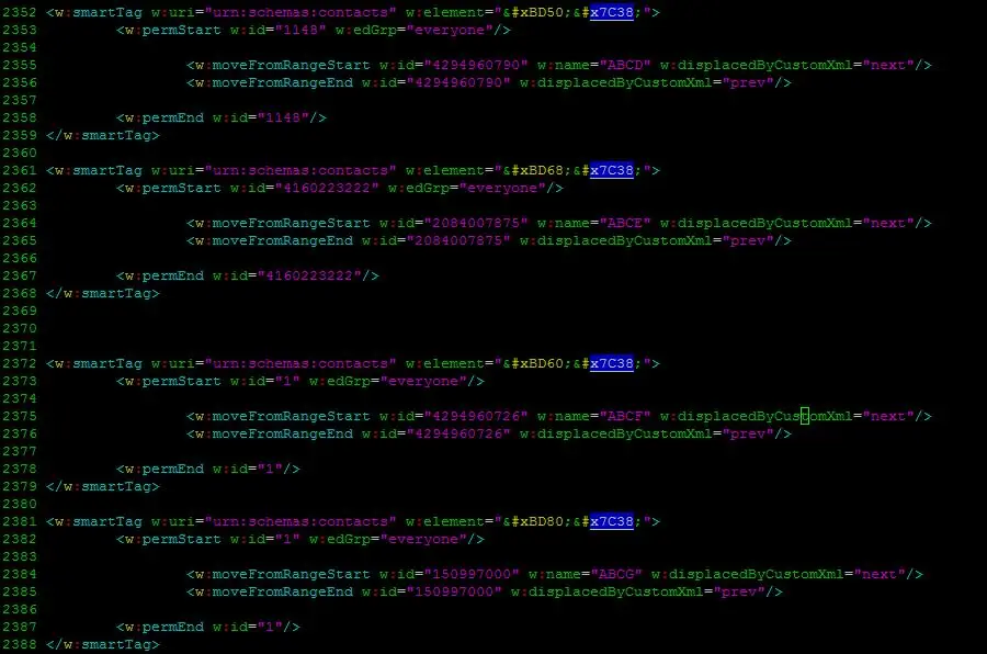 $smart_tag=/<w:smartTag[\w\W]+?w:element=\"(&#x[a-zA-Z0-9]{4};){2}\">[\w\W]+?<w:permStart[\w\W]+?w:displacedByCustomXml=\"prev\"\/>[\w\W]+?<w:permEnd[\w\W]+?<\/w:smartTag>/