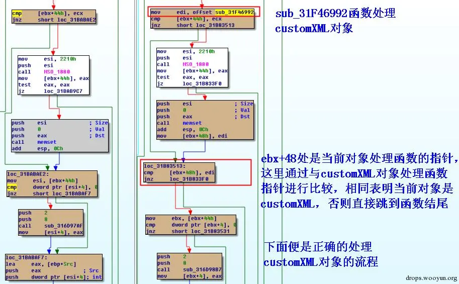 通过下面的补丁对比可以很容易看到打上最新补丁的word代码增加了对customXML对象处理函数的校验: