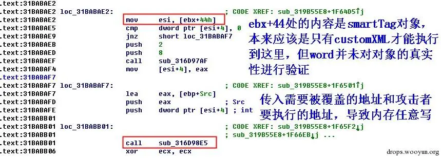 这个漏洞是一个类型混淆漏洞,本来带有displacedByCustomXml的标签会被上一个或下一个customXML代替,但是word没有对传入的customXML对象进行严格的校验,导致可以传入诸如smartTag对象,然而smartTag对象的处理流程和customXML并不相同,上述特殊处理的smartTag标签中的element属性值会被当作是一个地址,随后经过简单的计算得到另一个地址。最后处理流程会将moveFromRangeEnd的id值覆盖到之前计算出来的地址中,导致任意内存写入,漏洞代码如下: