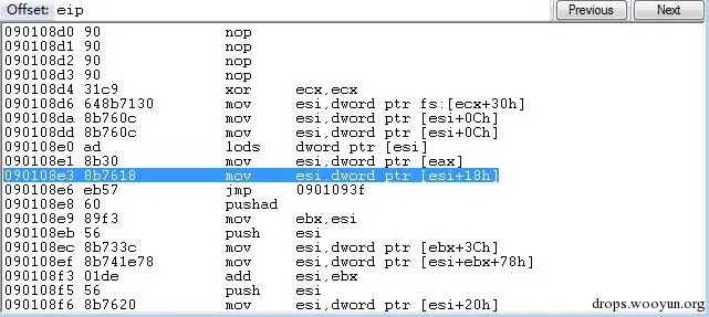 看到这段内存想必都已经清楚了,这里就是RTF文档释放的activeX.bin文件的内容,而0x7c342404处的代码是ret,因此这里会一直执行ret直到到达最终ROP的位置,ROP链如下: