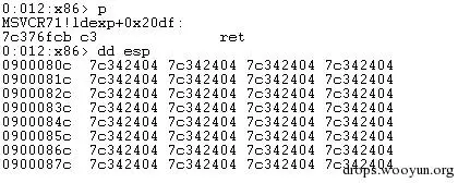 word在office2010的环境下没有打补丁的情况下执行的堆喷射后的地址为0x0900080C,如下: