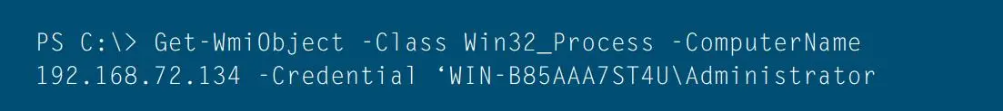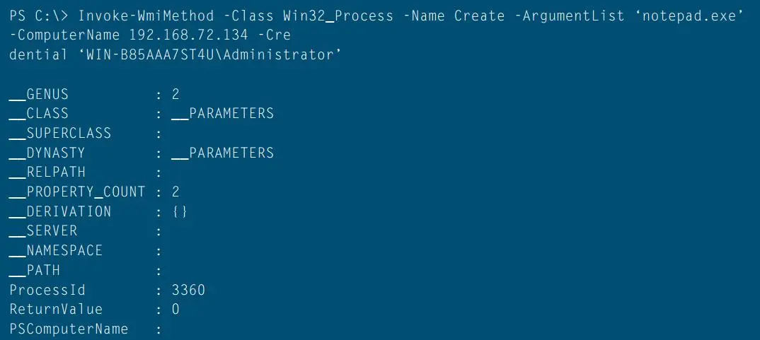 Win32_Process 类包含一个名为 Create 的静态方法,它可以在本地或远程创建进程。这种情况下 WMI 就等同于运行 psexec.exe 一样,只是没有了不必要的取证操作,如创建服务。下面的示例演示了在远程机器上执行进程:
