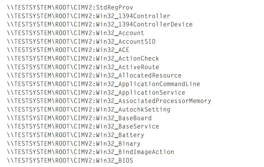 下面是由上述脚本执行后返回的完整 WMI 类路径的一部分结果: