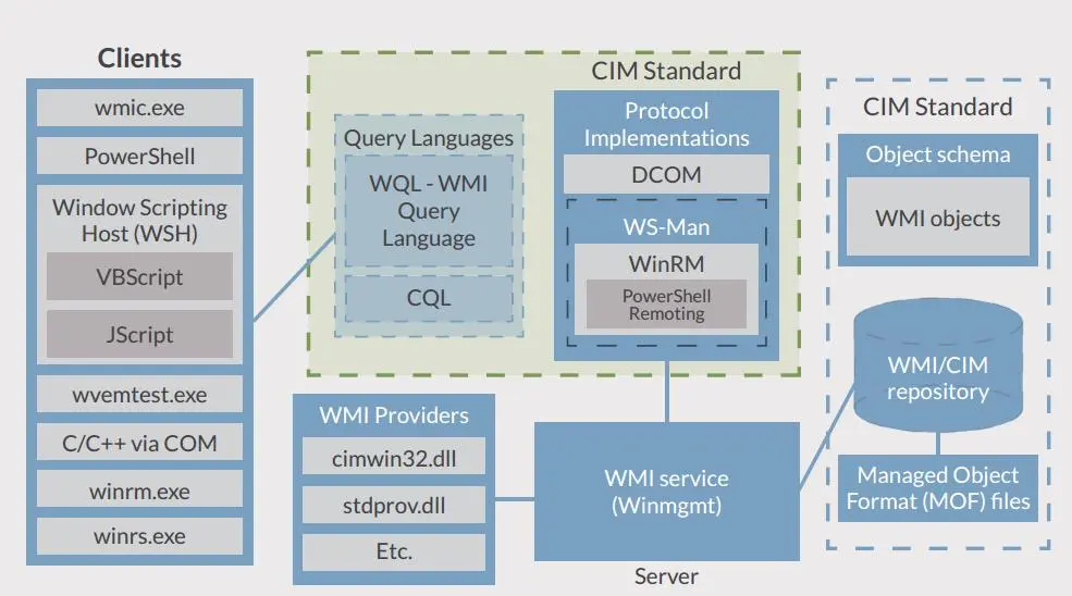 WMI 的全称是 Windows Management Instrumentation,即 Windows 管理规范,在 Windows 操作系统中,随着 WMI 技术的引入并在之后随着时间的推移而过时,它作为一项功能强大的技术,从 Windows NT 4.0 和 Windows 95 开始,始终保持其一致性。它出现在所有的 Windows 操作系统中,并由一组强大的工具集合组成,用于管理本地或远程的 Windows 系统。