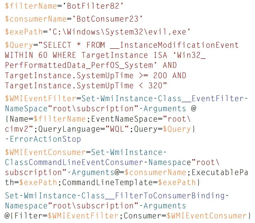 图 5 中的 PowerShell 代码是修改过的存在于 SEADADDY 恶意软件家族中的 WMI 持久性代码实例。该事件筛选器取自 PowerSploit 的持久性模块,目的是在系统启动后不久触发,事件消费者只需执行一个具有系统权限的可执行文件。图 5 中的事件筛选器在系统启动后的 200 和 320 秒之间被当作一个触发器。在事件被触发时事件消费者会执行已指定好的可执行文件。通过指定筛选器和一个 __FilterToConsumerBinding 实例将筛选器和消费者注册并将二者绑定在一起。