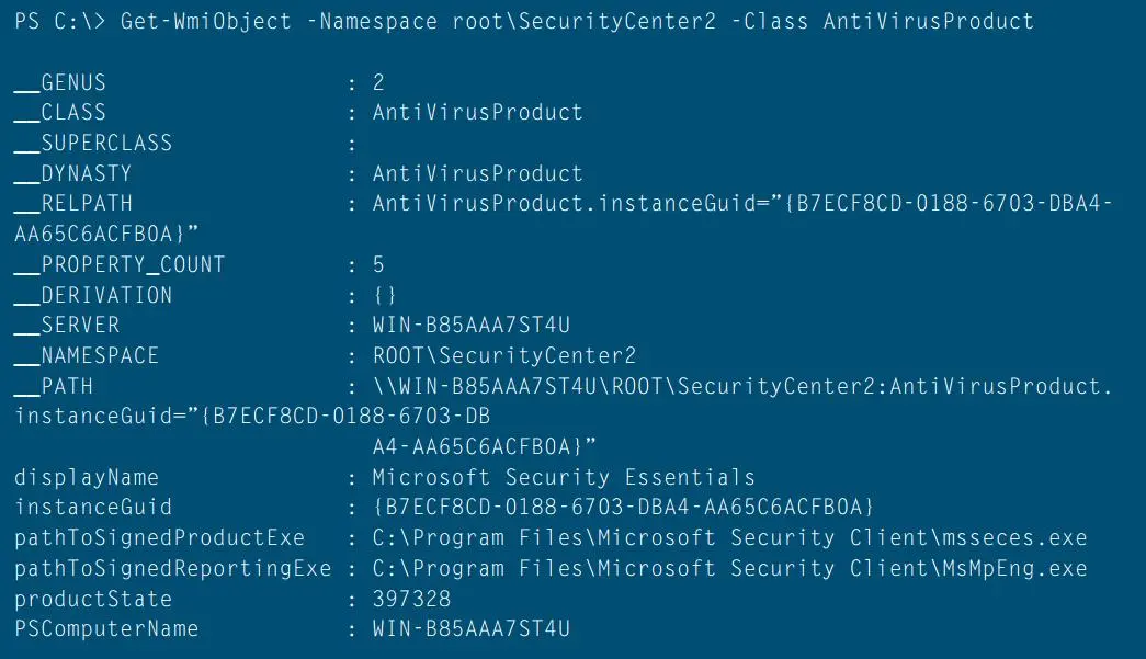已安装的 AV 产品通常会将自己注册在 WMI 中的 AntiVirusProductclass 类中的 root\SecurityCenter 或者是 root\SecurityCenter2 命名空间中,具体是哪一个命名空间则取决于操作系统的版本。