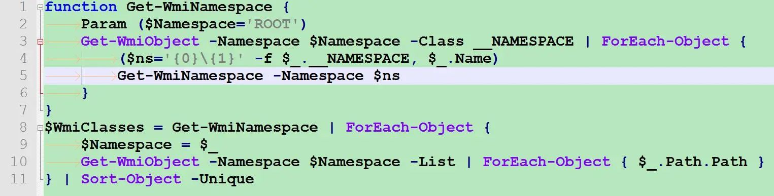 图 2:列举所有 WMI 类和命名空间的 PowerShell 示例代码