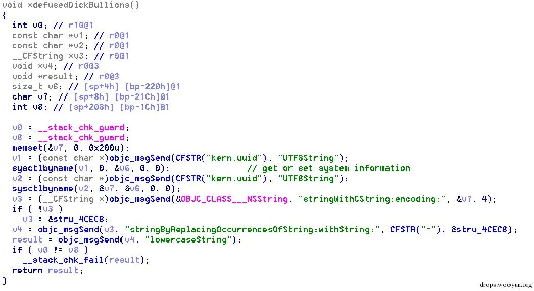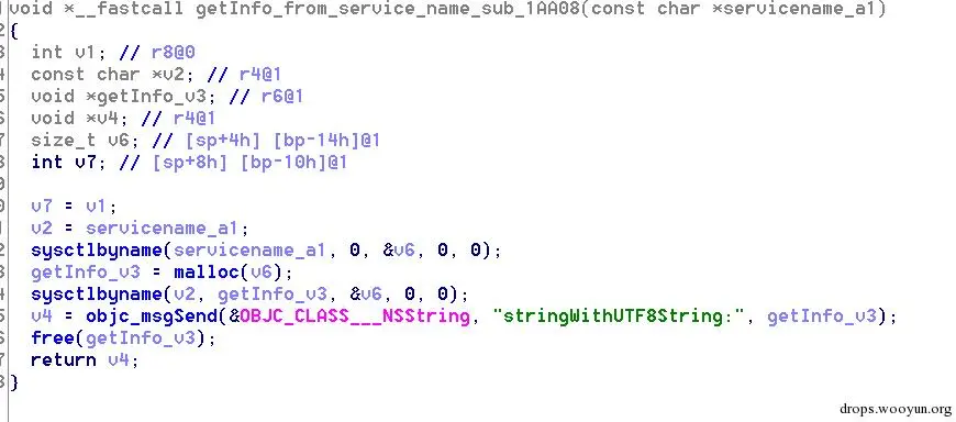 如上函数假设参数*servicename_a1传递值为hw.machine时,返回设备硬件信息为iPhone3,1