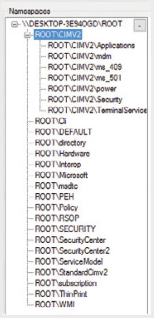 例如,图 12 列出了一些安装在纯净版 Windows 10 上的命名空间。请注意,它们可以很简单的被表示为树状。当客户端没有声明其本身的命名空间时, WMI 会选择 ROOT\CIMV2 命名空间作为默认的命名空间。