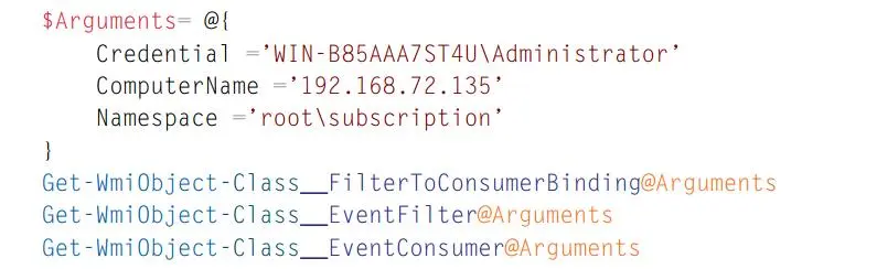 通过 EventConsumers 对 WMI 持久性的检测是微不足道的。图 11 中的 PowerShell 代码会查询远程系统上的所有 WMI 持久性项目。