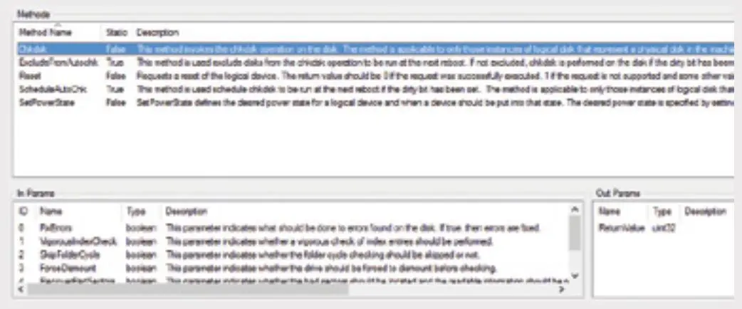 图 15 列出了 Win32_LogicalDisk 类实例中已公开的方法。此类定义声明了五种方法并且相关联的 WMI 提供程序允许客户端能够调用 Win32_LogicalDisk 实例的这些方法。面板底部的两个窗口描述了调用方法必须提供的参数和返回的数据。在此示例中,Chkdsk 方法需要五个布尔型参数并返回了一个描述操作状态的 32 位整数。请注意, Description 限定符附加到这些方法后其参数将作为 WMI 客户端开发者的 API 文档。