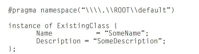 在 MOF 中定义类的一个实例,需要在类名后使用 instance 关键字, 名称-值的键值对列表用来填充具体的属性值。图 21 列出了一个创建 \\.\ROOT\default\ExistingClass 类的实例的 MOF 文件,并分别给 Name 和 Description 属性提供了具体的值 SomeName 和 SomeDescription 。其余字段将会默认填充为 nil 。